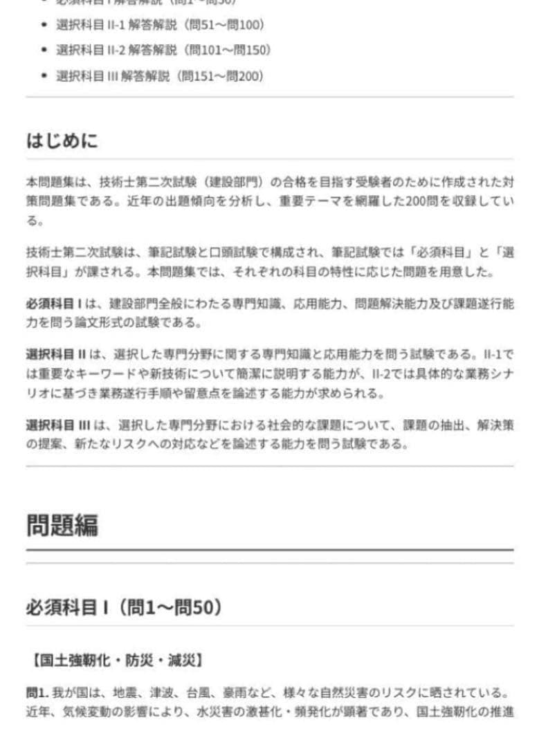 ・必須科目 I:問1〜問50(建設部門全般の課題解決能力を問う論文形式問題)