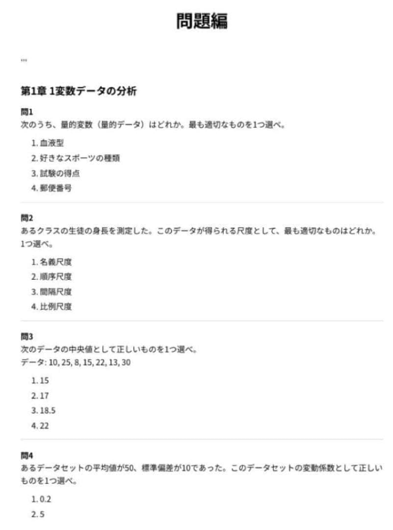 「記述統計の深化 → 推測統計の理論習得 → 分析手法の実践的応用」というステップで学習できるよう体系的に構成されており、全問に対して数式や図表の解釈を含む詳細な解説を付しています。