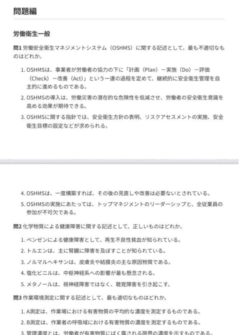 ・ 第1部:労働衛生一般(OSHMS、有害物質の健康影響、物理的有害因子、産業生態学)