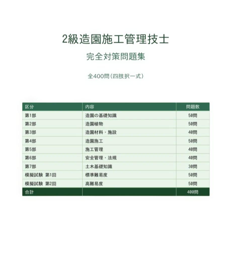 2級造園施工管理技士試験対策問題集300問+模擬試験問題50問×2 全400問
