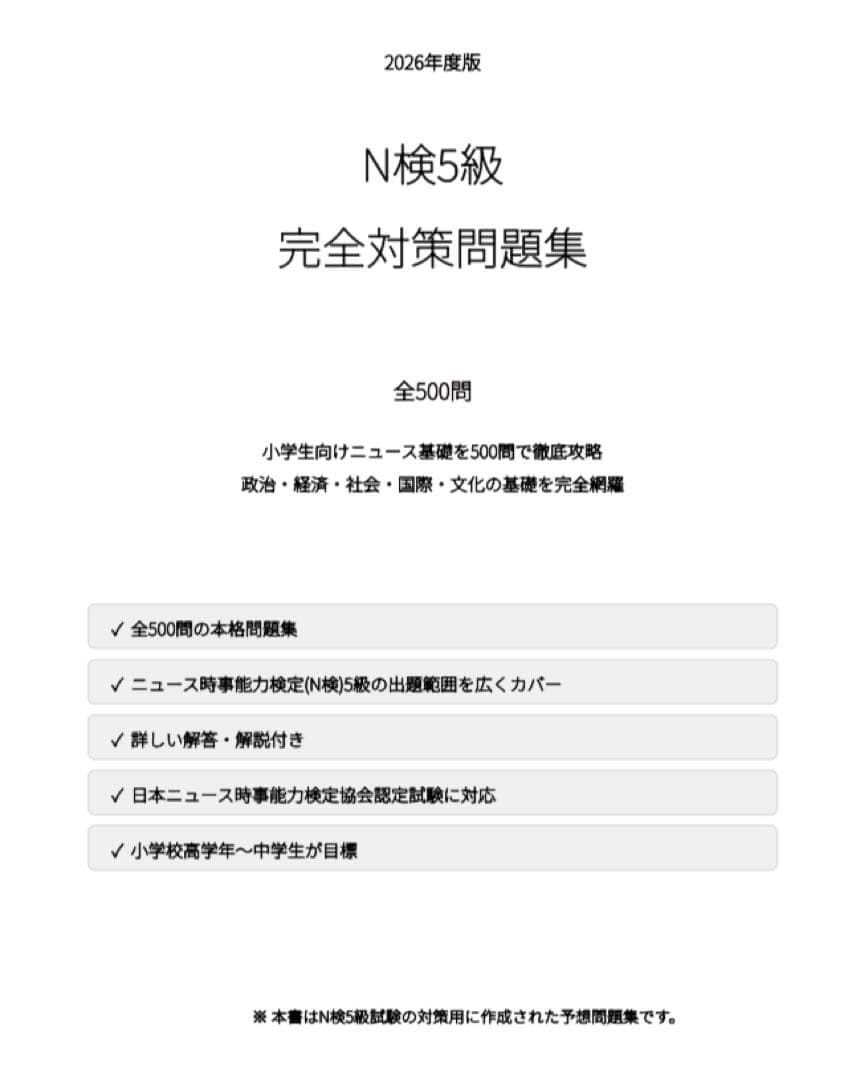【N検(ニュース時事能力検定)5級】試験対策問題集500問 解答解説付き