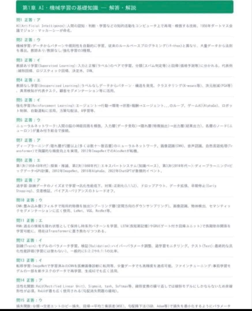 本問題集は、AIの基礎理論から、RAGやAIエージェントといった最新技術、そしてAI新法を含む倫理・法規制までを網羅した全800問の完全対策教材です。