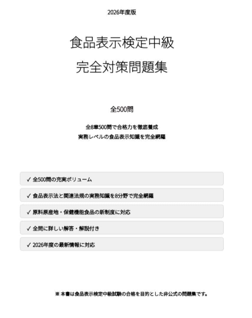 食品表示検定中級試験の合格を目指す方のための完全対策問題集です。