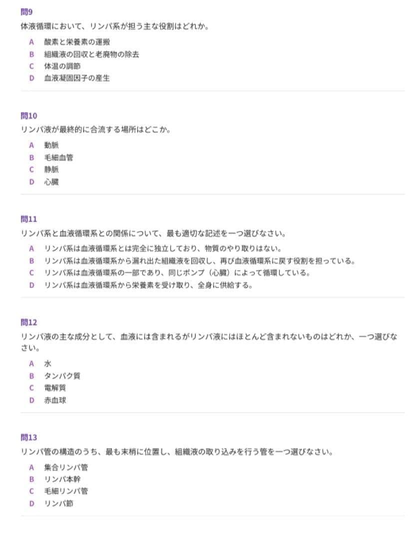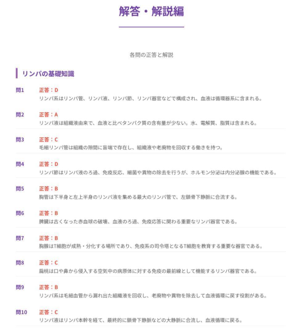 前半に問題、後半に解答・解説を収録しており、知識の確認だけでなく、リンパの流れや身体の仕組みへの理解を深めながら学習を進めやすい内容になっています。