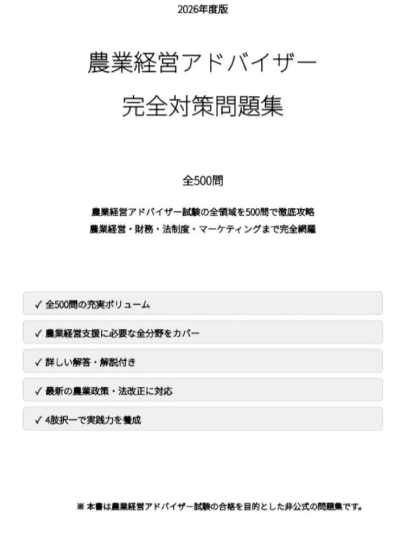 本問題集は、農業経営アドバイザー試験の出題範囲を体系的に整理した試験対策問題集です。