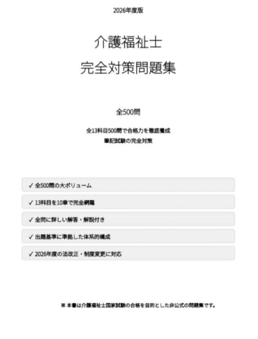 介護福祉士国家試験の全13科目を10章に整理し、500問を収録。介護保険制度から医療的ケアまで、出題範囲を漏れなくカバーしています。