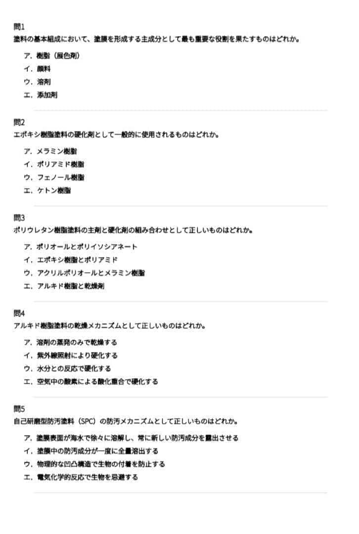 試験では、船舶塗料の種類、塗装工程、表面処理、防食技術、塗膜性能、施工管理など、船舶塗装に関する実務知識が幅広く出題されます。