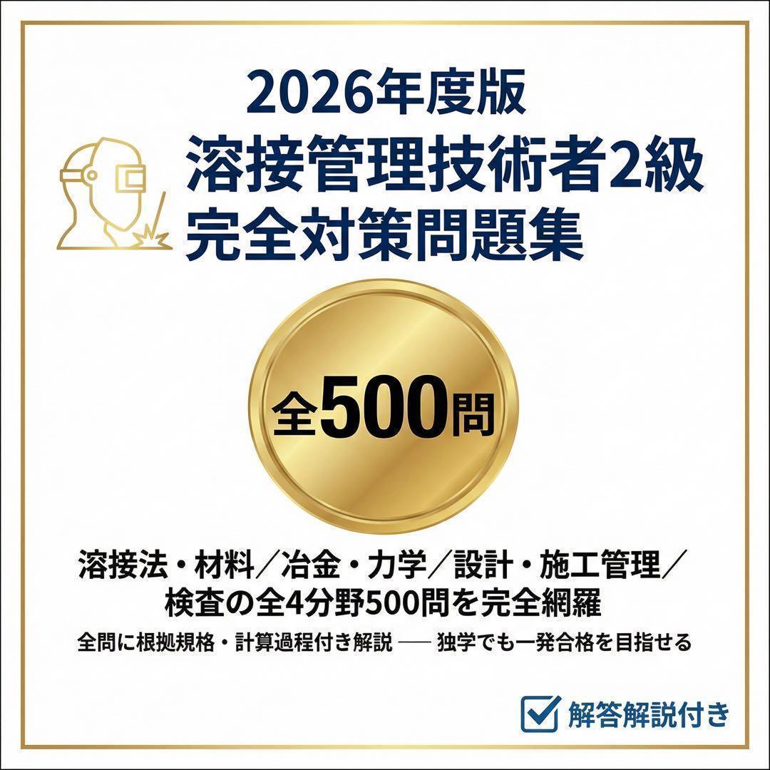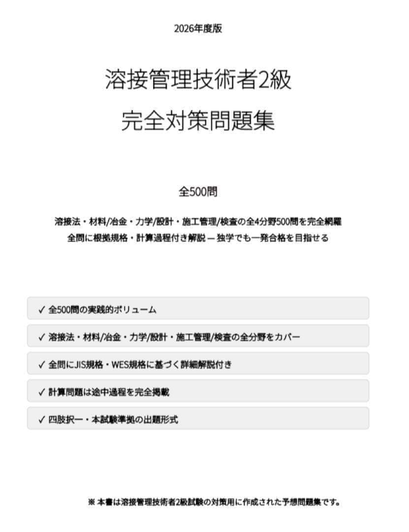 本問題集は、溶接管理技術者2級の学習範囲を体系的に整理した完全対策用の実践型問題集です。