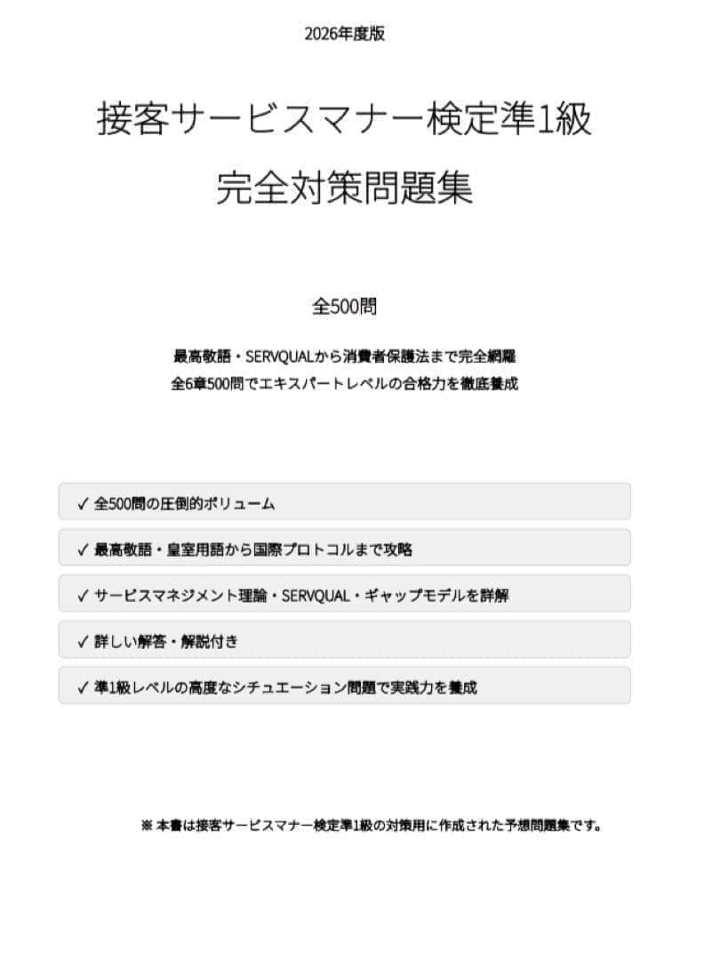 本問題集は、接客サービスマナー検定準1級の学習範囲を体系的に整理した