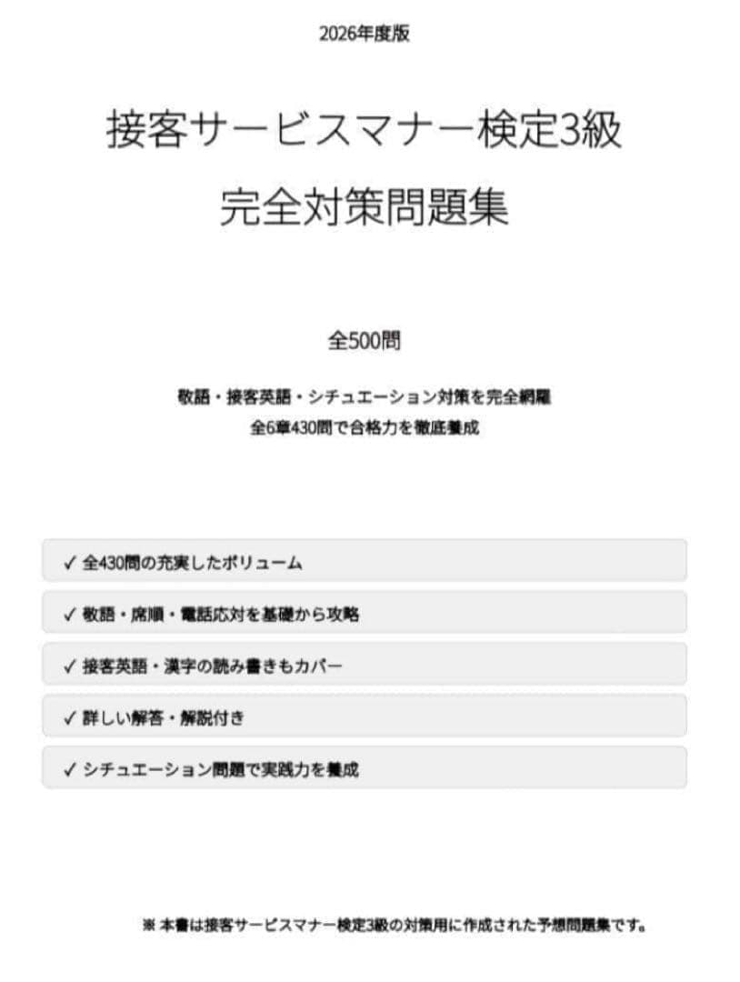 本問題集は、接客サービスマナー検定3級の学習範囲を体系的に整理した