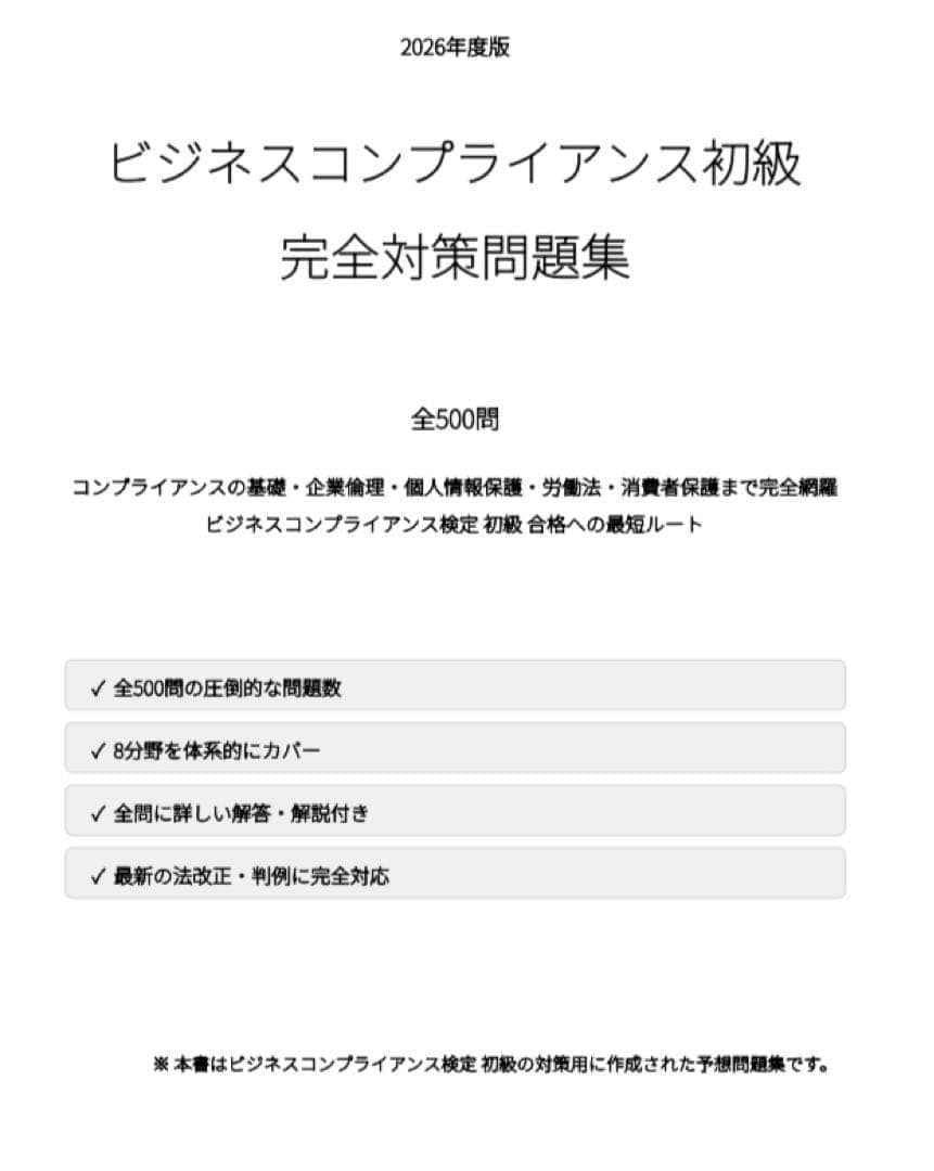 【ビジネスコンプライアンス初級】試験対策問題集500問 解答解説付き