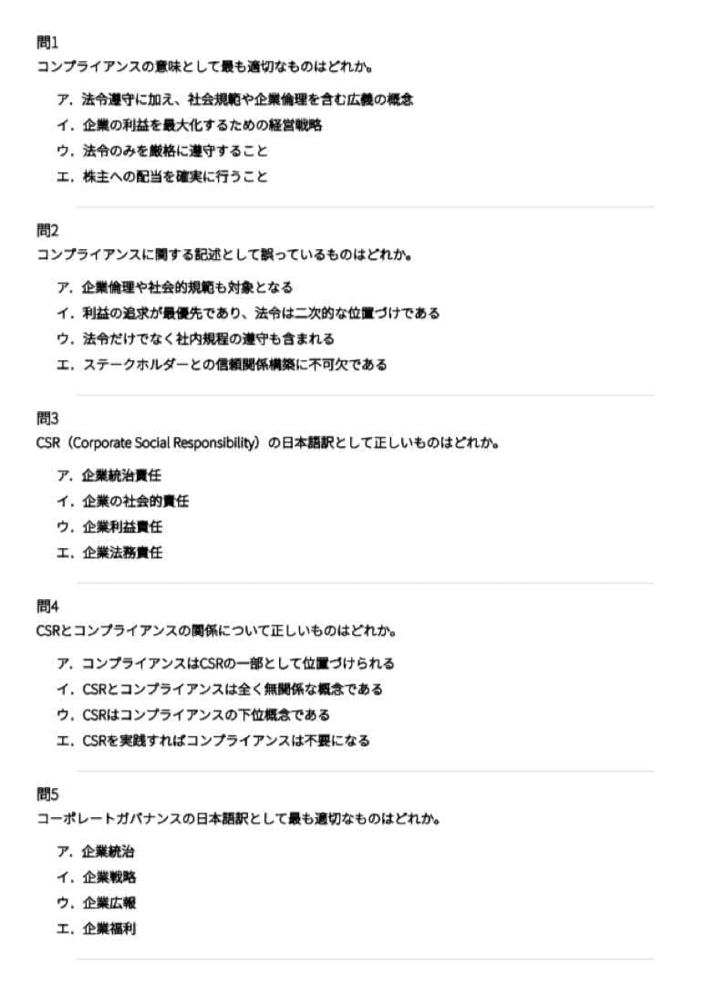本問題集は、ビジネスコンプライアンス初級の重要論点を体系的に整理した