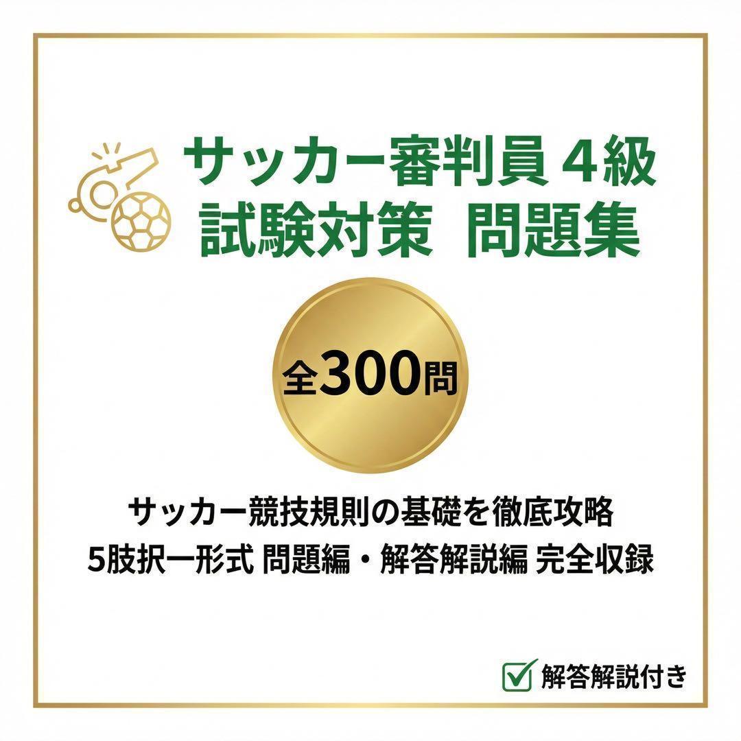 本問題集は、サッカー審判員4級試験の出題範囲を体系的に整理した全300問の試験対策問題集です。