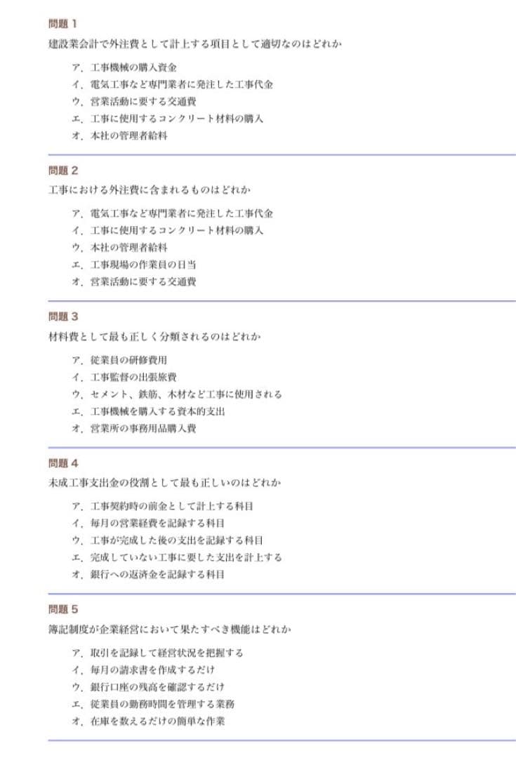 など、建設業会計の基礎を中心とした実務知識が出題されます。