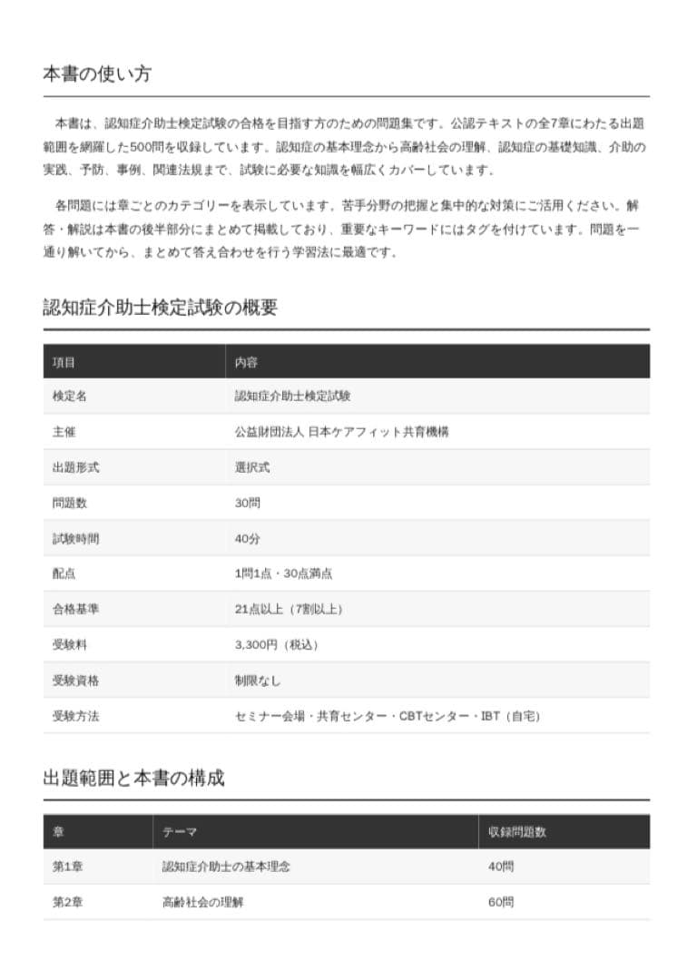本教材は、認知症介助士検定試験の出題範囲をしっかり押さえた、全500問収録の本格的な試験対策問題集です。