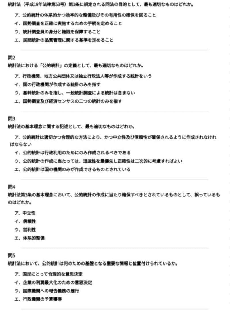 試験では、統計調査の基礎、標本調査、統計データの整理方法、統計指標、統計法など、統計に関する幅広い分野が出題されます。