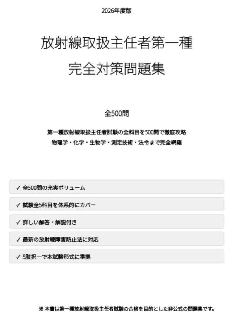 本問題集は、第一種放射線取扱主任者試験の出題範囲を体系的に整理した試験対策問題集です。