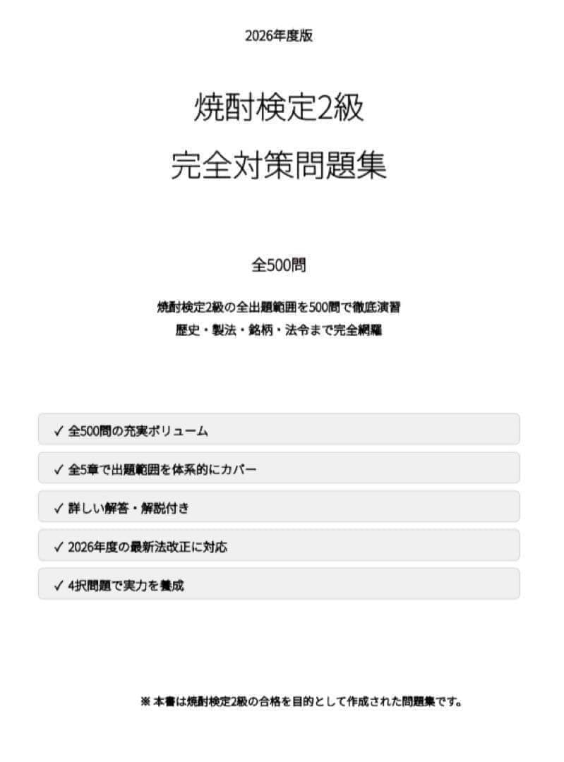 本問題集は、焼酎検定2級の学習範囲を体系的に整理した完全対策用の実践型問題集です。