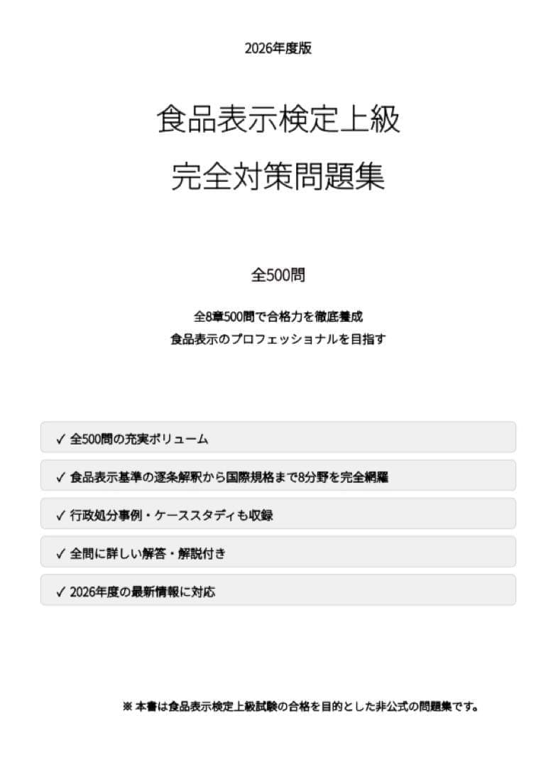 食品表示検定上級試験の合格を目指す方のための完全対策問題集です。