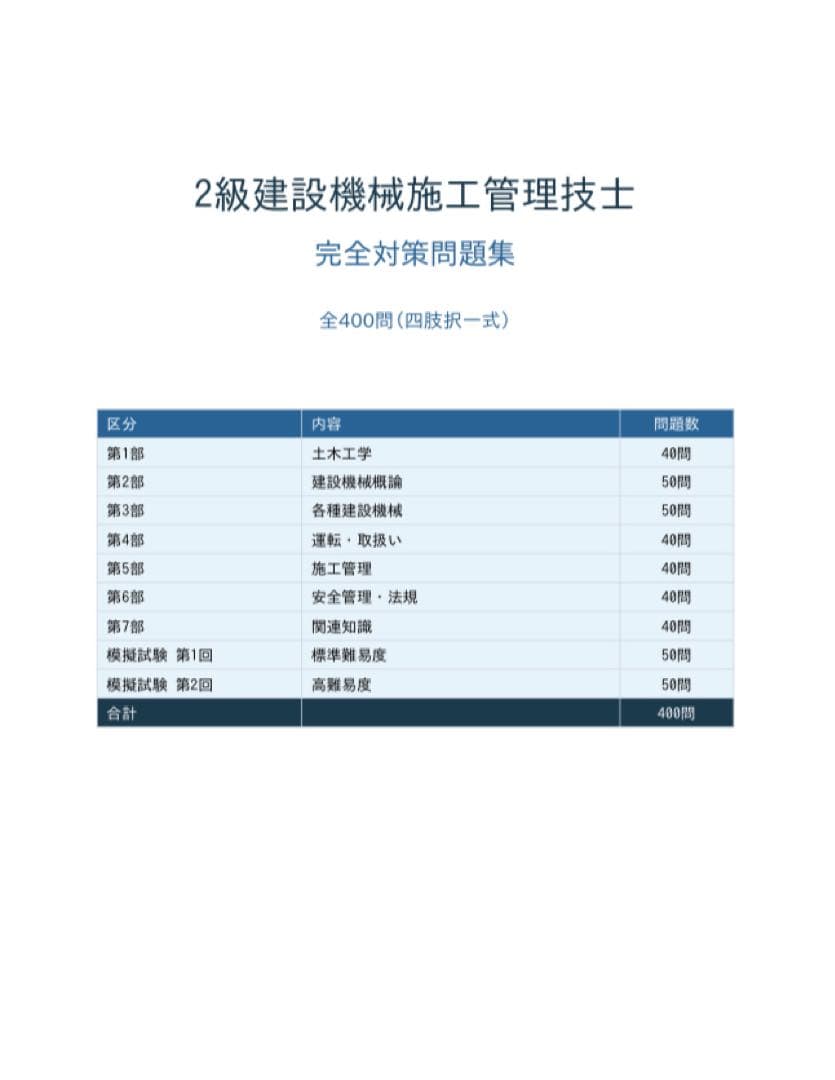 2級建設機械施工管理技士対策問題集300問+模擬試験50問×2セット全400問