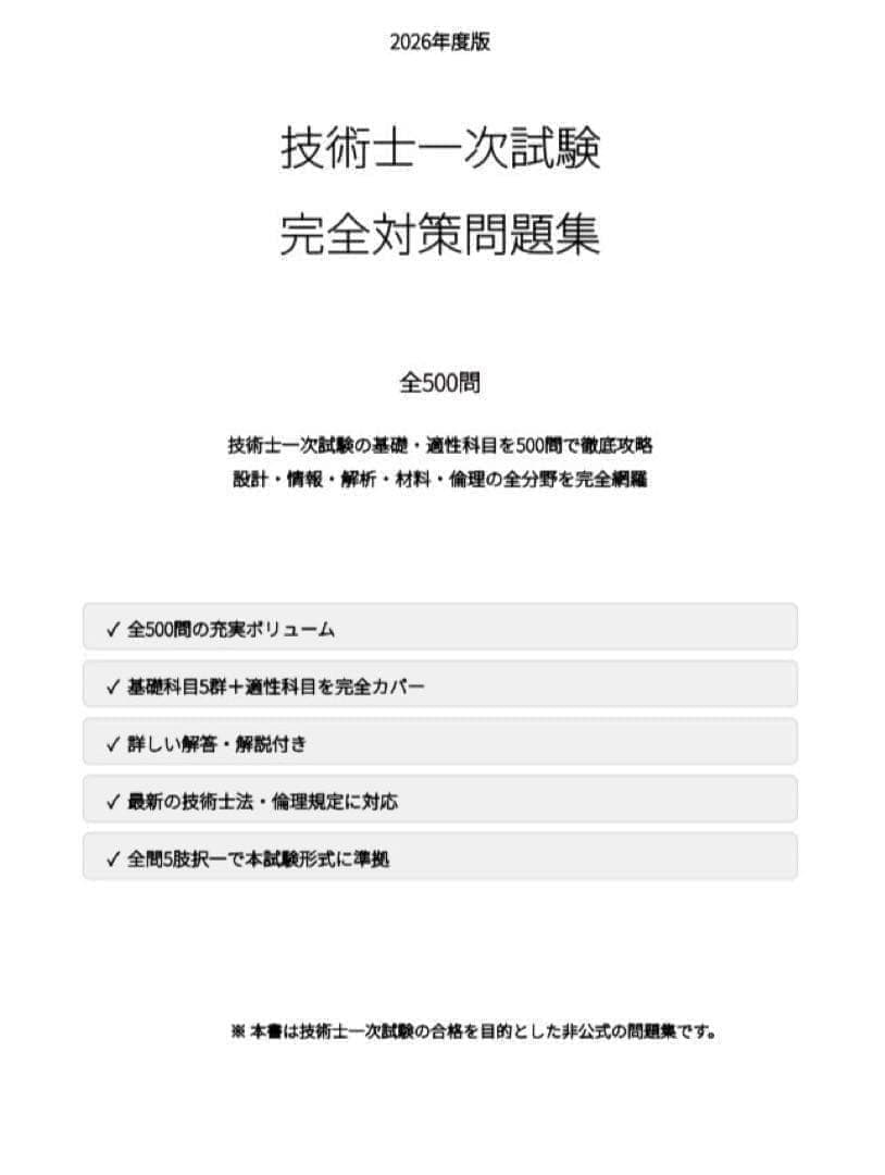 本問題集は、技術士第一次試験の出題範囲を体系的に整理した試験対策問題集です。