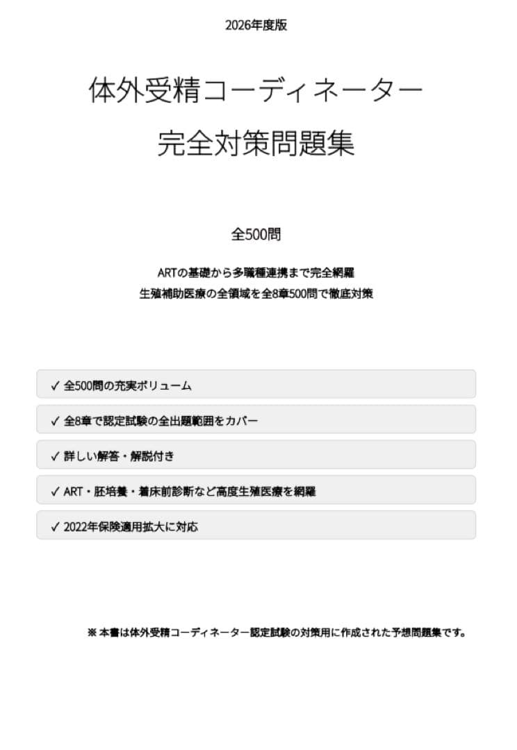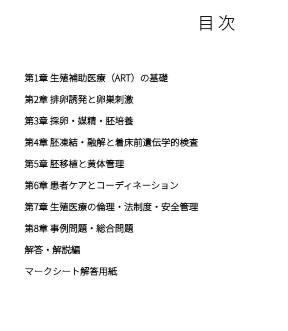 生殖医療の基礎から、治療工程、患者支援、倫理、実務対応まで段階的に学習できる構成となっており、試験対策としてはもちろん、生殖医療の現場で必要となる基礎知識を整理する教材としても活用しやすい内容です。