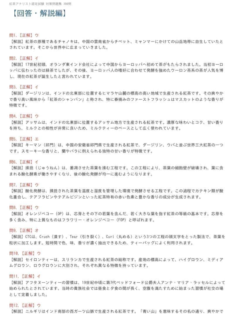 本問題集は、試験範囲を体系的に整理した全300問構成の完全対策教材です。単なる暗記問題にとどまらず、製造理論・評価用語・歴史的背景・文化的文脈まで踏み込んだ内容となっており、紅茶を専門的に理解したい方に対応しています。