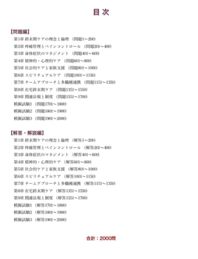 本問題集は、終末期ケア専門士試験の出題範囲を体系的に整理した、全2000問構成の大ボリューム問題集です。