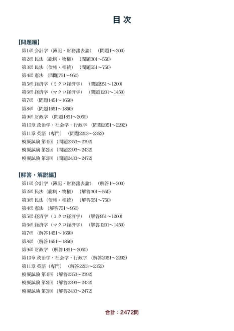 本問題集は、国税専門官試験の出題範囲を体系的に整理し、全2472問を収録した大容量の試験対策教材です。