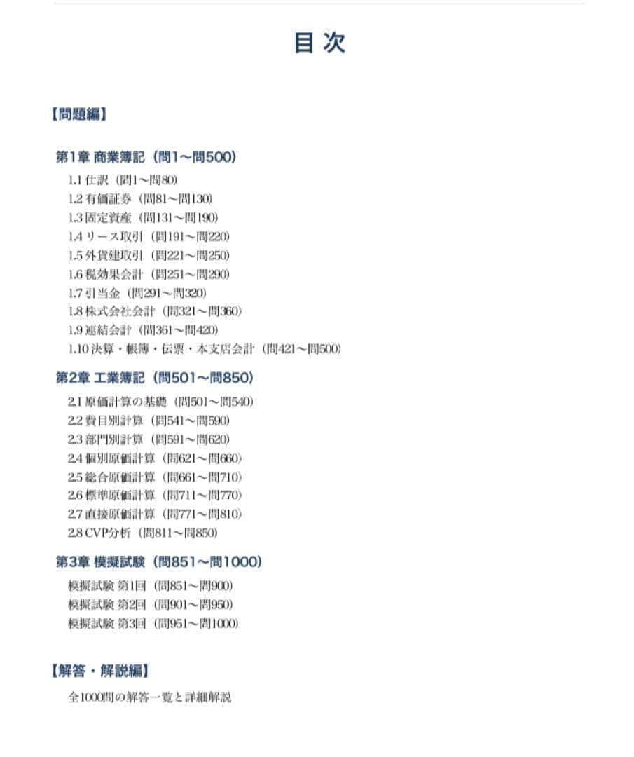 商業簿記500問、工業簿記350問、模擬試験150問で構成されており、4択問題で段階的に実力を養える内容になっています。