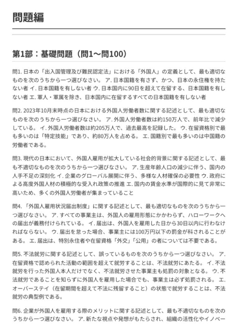 本問題集は、外国人雇用管理主任者試験の出題範囲を体系的に整理した全500問構成の完全対策問題集です。